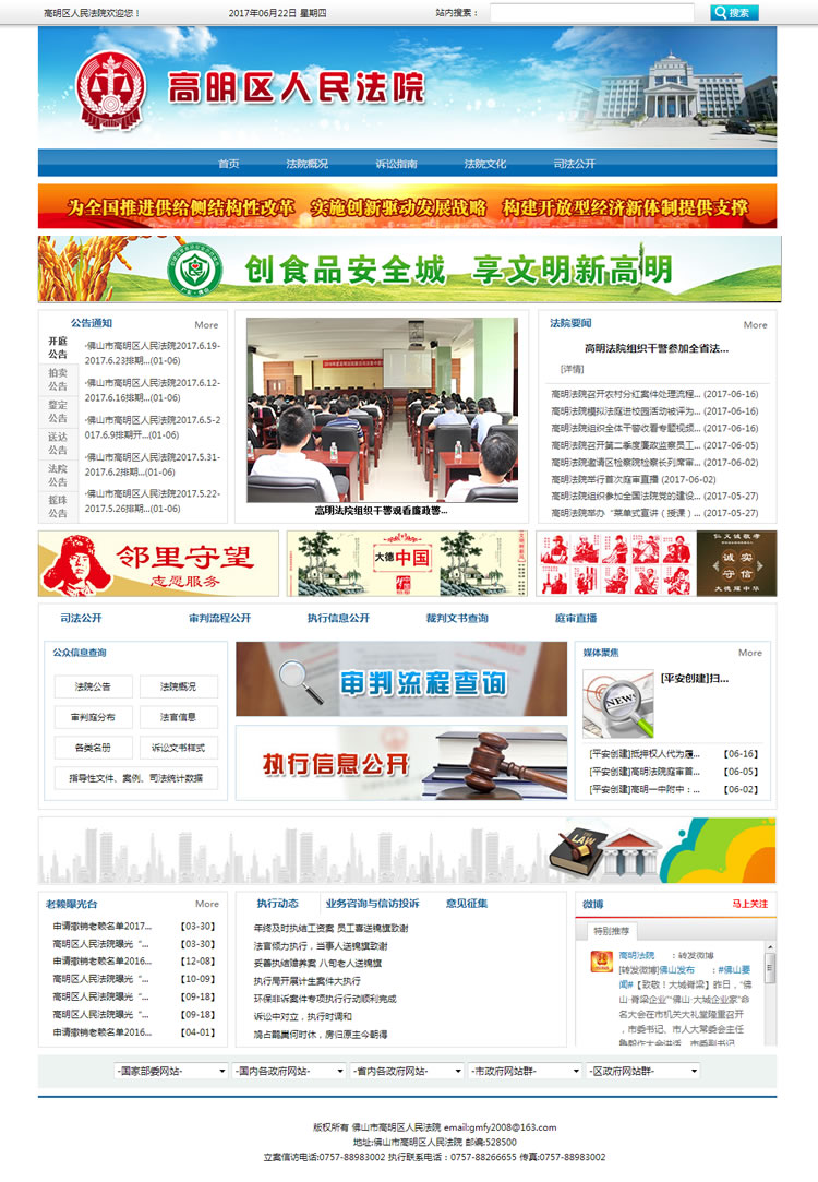 簡(jiǎn)介:佛山市高明區(qū)人民法院設(shè)有刑事審判庭、民事審判一庭、民事審判二庭、行政審判庭、少年審判庭、審判監(jiān)督庭、立案庭、執(zhí)行局、政工科、研究室、辦公室、紀(jì)檢監(jiān)察室、法警大隊(duì)等13個(gè)部門,下轄荷城、明城、楊和、更合四個(gè)人民法庭,現(xiàn)有在編干警142人。Official Webeite Addess