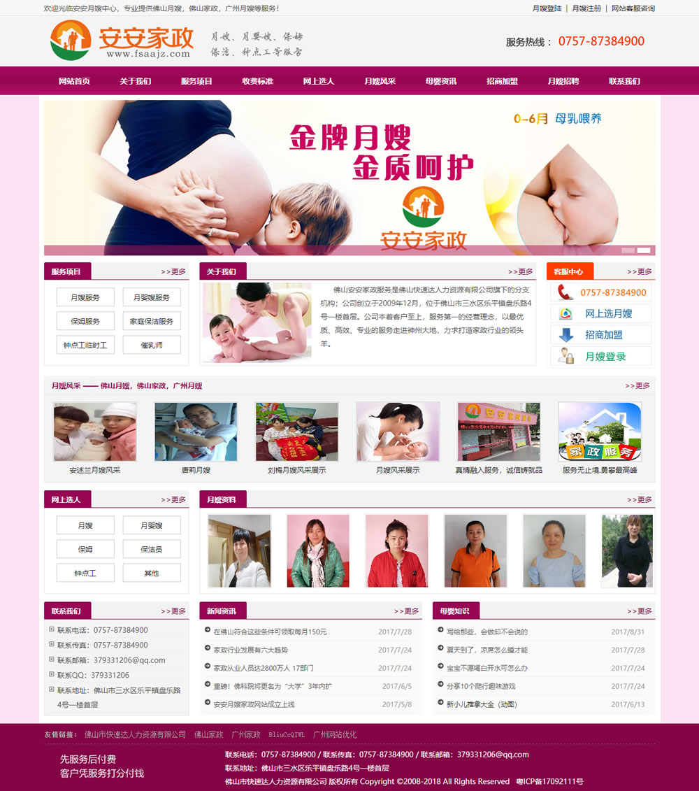 簡介:佛山安安家政是佛山快速達(dá)人力資源有限公司旗下的分支機(jī)構(gòu);公司創(chuàng)立于2009年12月,位于佛山市三水區(qū)樂平鎮(zhèn)盤樂路4號一樓首層。安安家政主要服務(wù)項(xiàng)目有:提供月嫂、育嬰師、保姆、老人護(hù)理員、家庭保潔、搬家服務(wù)及家政培訓(xùn)服務(wù)。Official Webeite Addess