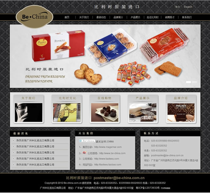 Be.China(廣州中比進出口有限公司) 是由迄今已成為在7個國家擁15個分公司的跨國物流集團MAGEGROUP(瑪吉集團)總裁Philippe Mairlo先生在中國注資的全外資進出口貿(mào)易有限公司。是由比利時政府官方在中國唯一指定的代理比利時高品質(zhì)食品的進口商。公司主要代理經(jīng)營比利時巧克力、餅干、糖果、水、啤酒等優(yōu)質(zhì)進口食品以及進口化妝品,目前已是比利時知名品牌Charlemagne、Bruyerre、Flaronis、Galler、Gaetan、Poppies、Silly、STY、Zizi Coin Coin、Ordal、BeChocolate的中國代理商。